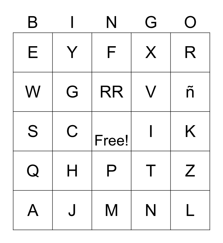 This bingo card has a free space and 29 words: A, B, C, D, E, F, G, H, I, J, K, L, M, N, ñ, O, P, Q, R, S, T, U, V, W, X, Y, Z, RR and LL.