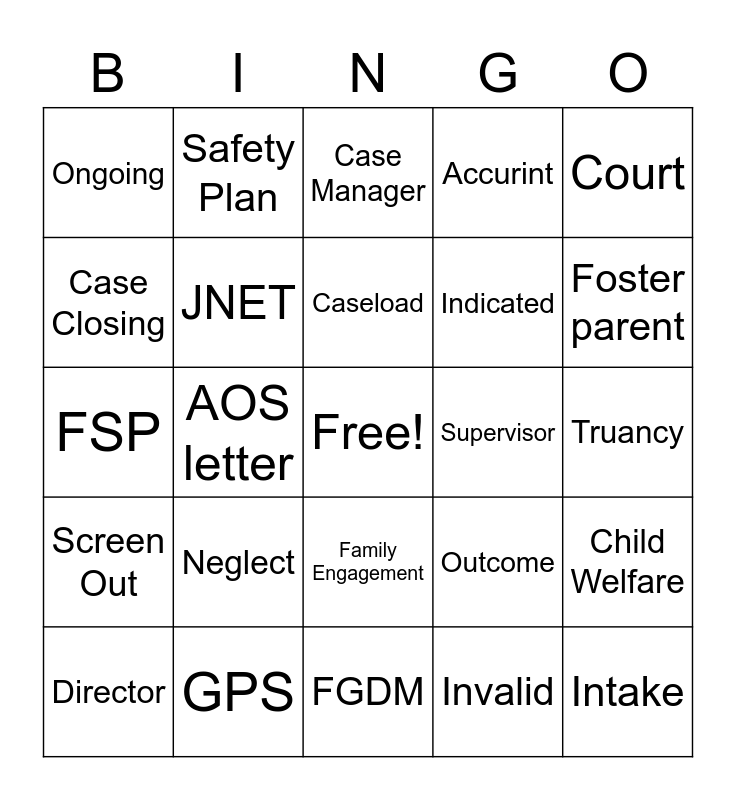 This bingo card has a free space and 58 words: Home Visit, GPS, CPS, Screen Out, Invalid, Valid, JNET, Unfounded, Indicated, DPW Check, Accurint, Alleged Victim, Phone Call, Email, Caseworker, Ongoing, Intake, Court, Legal Consult, Caseload, Supervisor, Case Manager, Director, Child Welfare, Inappropriate Discipline, Truancy, Homelessness, Adoptive parent, Foster parent, Birth parent, Foster child, Kinship provider, Dependency court, Adjudication, Safety assessment, Case note, Risk assessment, AOS letter, FSP, Child Abuse, Neglect, Substance Abuse, Outcome, Investigation, School Visit, Clerical, Data, Family Engagement, FGDM, Placement, Adoption, Independent Living, MDT, On Call, Safety Plan, Case Transfer, Case Closing and Children and Youth.