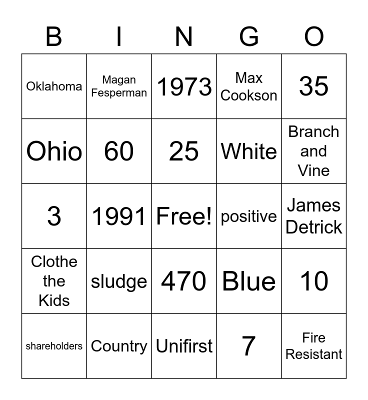 This bingo card has a free space and 24 words: sludge, Country, 25, shareholders, 35, Oklahoma, Ohio, Magan Fesperman, positive, 470, White, 3, Blue, 10, 60, 7, James Detrick, 1973, Branch and Vine, 1991, Fire Resistant, Clothe the Kids, Max Cookson and Unifirst.