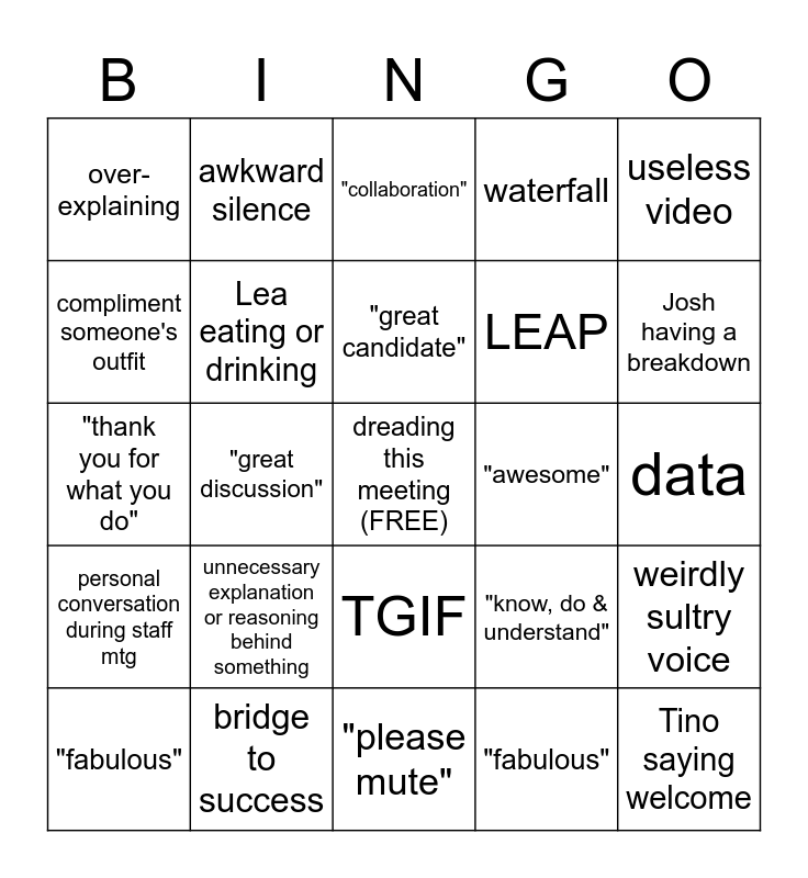 This bingo card has a free space and 24 words: unnecessary explanation or reasoning behind something, bridge to success, "great candidate", "fabulous", useless video, over-explaining, compliment someone's outfit, awkward silence, "awesome", TGIF, LEAP, "thank you for what you do", "know, do & understand", weirdly sultry voice, Lea eating or drinking, "fabulous", data, "collaboration", Josh having a breakdown, "great discussion", Tino saying welcome, personal conversation during staff mtg, waterfall and "please mute".
