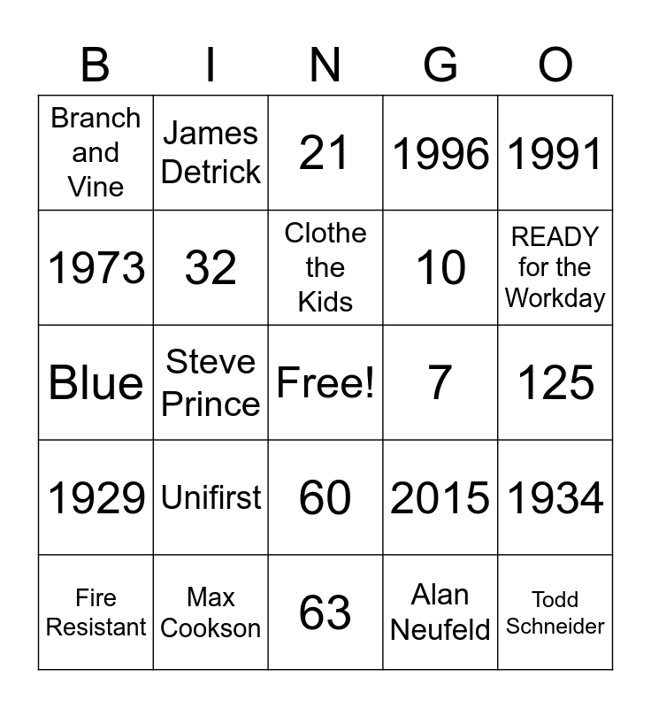 This bingo card has a free space and 24 words: Unifirst, Max Cookson, Clothe the Kids, Fire Resistant, 1991, Branch and Vine, 1973, James Detrick, 7, 60, 10, Blue, 2015, 1934, 32, Alan Neufeld, 125, 21, READY for the Workday, Steve Prince, Todd Schneider, 1929, 1996 and 63.