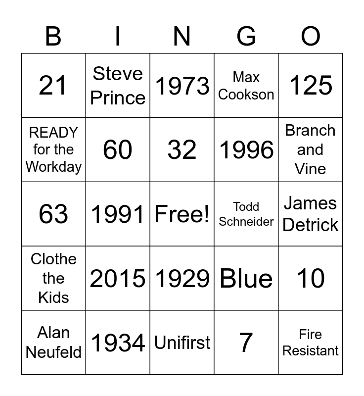 This bingo card has a free space and 24 words: 2015, 1934, 32, Alan Neufeld, 125, 21, READY for the Workday, Steve Prince, Todd Schneider, 1929, 1996, 63, Blue, 10, 60, 7, James Detrick, 1973, Branch and Vine, 1991, Fire Resistant, Clothe the Kids, Max Cookson and Unifirst.
