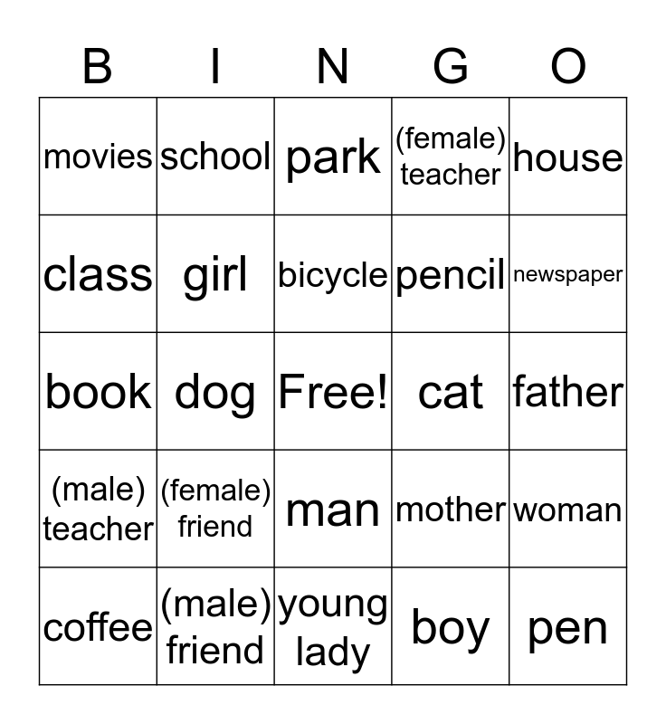 This bingo card has a free space and 24 words: (female) friend, (male) friend, bicycle, coffee, house, movies, class, school, cat, man, pencil, book, mother, woman, girl, boy, father, park, newspaper, dog, pen, (male) teacher, (female) teacher and young lady.