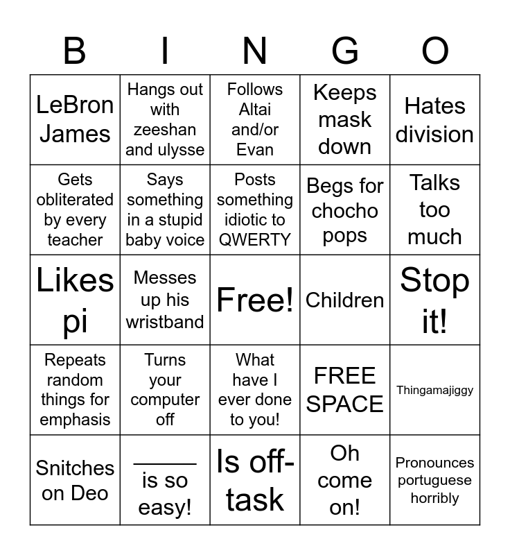 This bingo card has a free space and 25 words: Turns your computer off, Is off-task, Posts something idiotic to QWERTY, Snitches on Deo, Hates division, LeBron James, Gets obliterated by every teacher, Hangs out with zeeshan and ulysse, Children, What have I ever done to you!, Begs for chocho pops, Likes pi, FREE SPACE, Thingamajiggy, Says something in a stupid baby voice, Touches someone's face without permission, Stop it!, Follows Altai and/or Evan, Talks too much, Messes up his wristband, Pronounces portuguese horribly, _____ is so easy!, Repeats random things for emphasis, Keeps mask down and Oh come on!.