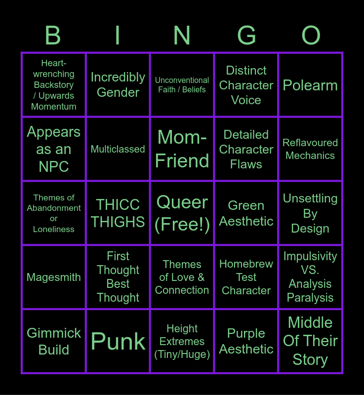 This bingo card has a free space and 24 words: First Thought Best Thought, Punk, Mom-Friend, Gimmick Build, Polearm, Heart-wrenching Backstory / Upwards Momentum, Appears as an NPC, Incredibly Gender, Green Aesthetic, Themes of Love & Connection, Detailed Character Flaws, Themes of Abandonment or Loneliness, Homebrew Test Character, Impulsivity VS. Analysis Paralysis, Multiclassed, Purple Aesthetic, Unsettling By Design, Unconventional Faith / Beliefs, Reflavoured Mechanics, THICC THIGHS, Middle Of Their Story, Magesmith, Distinct Character Voice and Height Extremes (Tiny/Huge).