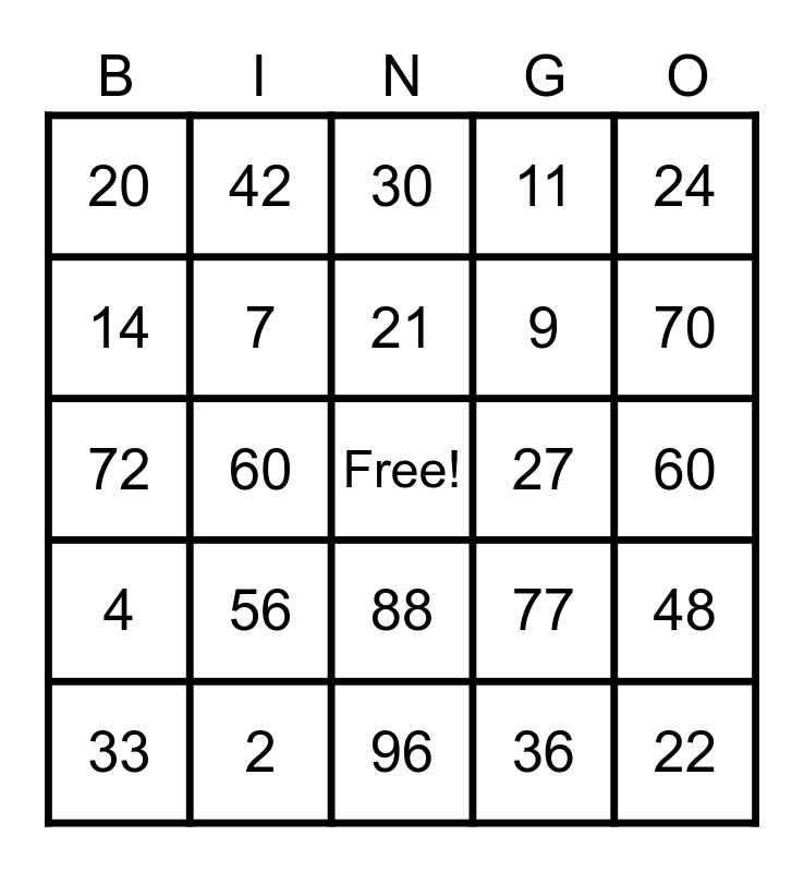 This bingo card has a free space and 62 words: 1, 2, 3, 4, 5, 6, 7, 8, 9, 10, 11, 12, 14, 16, 18, 20, 22, 24, 15, 21, 27, 30, 33, 36, 28, 32, 40, 44, 48, 25, 35, 45, 50, 55, 60, 42, 48, 54, 60, 66, 72, 49, 56, 63, 70, 77, 84, 64, 72, 80, 88, 96, 81, 90, 99, 108, 100, 110, 120, 121, 132 and 144.
