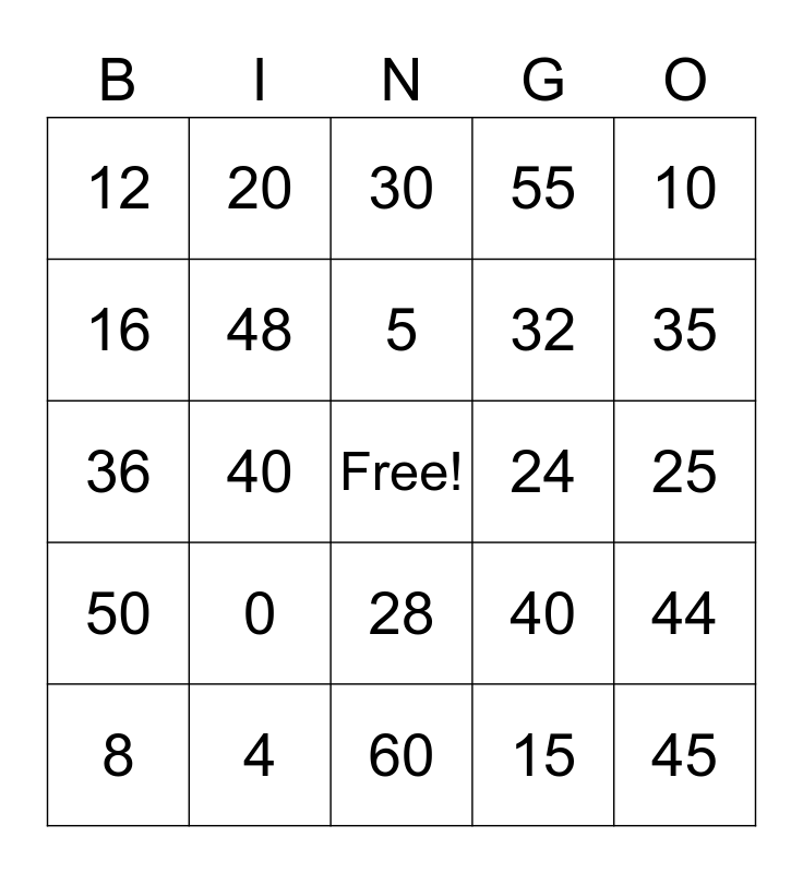 This bingo card has a free space and 24 words: 0, 4, 5, 8, 10, 12, 16, 20, 24, 28, 32, 36, 40, 44, 48, 15, 25, 30, 35, 40, 45, 50, 55 and 60.