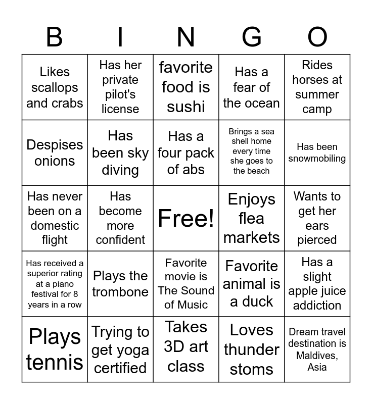 This bingo card has a free space and 24 words: Plays the trombone, Trying to get yoga certified, Has a four pack of abs, Plays tennis, Rides horses at summer camp, Likes scallops and crabs, Despises onions, Has her private pilot's license, Enjoys flea markets, Favorite movie is The Sound of Music, Brings a sea shell home every time she goes to the beach, Has never been on a domestic flight, Favorite animal is a duck, Has a slight apple juice addiction, Has been sky diving, Loves thunder stoms, Wants to get her ears pierced, favorite food is sushi, Has been snowmobiling, Has become more confident, Dream travel destination is Maldives, Asia, Has received a superior rating at a piano festival for 8 years in a row, Has a fear of the ocean and Takes 3D art class.