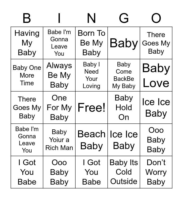 ⚠ This card has duplicate items: Don’t Worry Baby (2), Baby Love (2), I Got You Babe (2), Baby Yoiur a Rich Man (2), Beach Baby (2), Babe I'm Gonna Leave You (2), Baby I Love Your Way (2), Baby One More Time (2), Baby Boy (2), Always Be My Baby (2), Baby (2), Ooo Baby Baby (2), Ice Ice Baby (2), Baby Got Back (2), I'm Your Baby Tonight (2), Baby I Need Your Loving (2), Baby Hold On (2), Born To Be My Baby (2), There Goes My Baby (2), One For My Baby (2), Baby Its Cold Outside (2), Having My Baby (2)