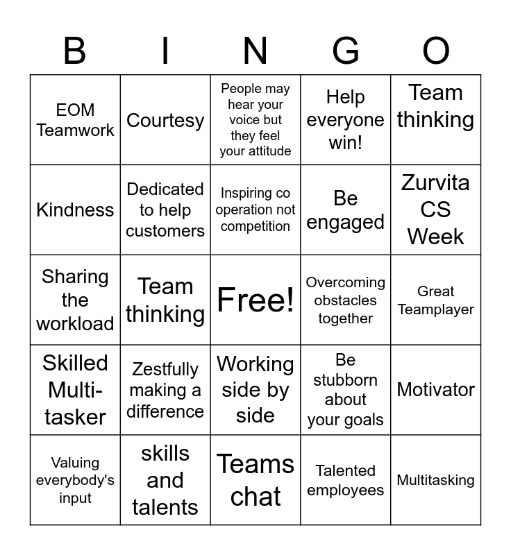 This bingo card has a free space and 24 words: Zestfully making a difference, skills and talents, Inspiring co operation not competition, Valuing everybody's input, Team thinking, EOM Teamwork, Kindness, Courtesy, Overcoming obstacles together, Working side by side, Be engaged, Sharing the workload, Be stubborn about your goals, Motivator, Dedicated to help customers, Talented employees, Great Teamplayer, People may hear your voice but they feel your attitude, Zurvita CS Week, Team thinking, Multitasking, Skilled Multi-tasker, Help everyone win! and Teams chat.