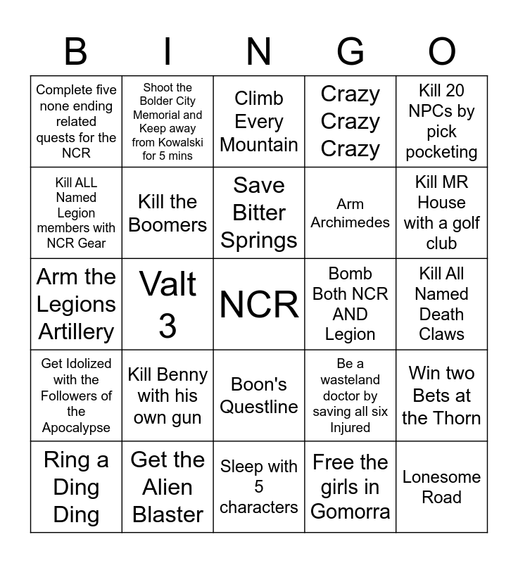 This bingo card has a free space and 24 words: Ring a Ding Ding, Kill Benny with his own gun, Save Bitter Springs, Free the girls in Gomorra, Kill 20 NPCs by pick pocketing, Complete five none ending related quests for the NCR, Shoot the Bolder City Memorial and Keep away from Kowalski for 5 mins, Climb Every Mountain, Bomb Both NCR AND Legion, Kill All Named Death Claws, Arm the Legions Artillery, Kill the Boomers, Be a wasteland doctor by saving all six Injured, Win two Bets at the Thorn, Kill ALL Named Legion members with NCR Gear, Get the Alien Blaster, Sleep with 5 characters, Crazy Crazy Crazy, Kill MR House with a golf club, Get Idolized with the Followers of the Apocalypse, Valt 3, Boon's Questline, Arm Archimedes and Lonesome Road.