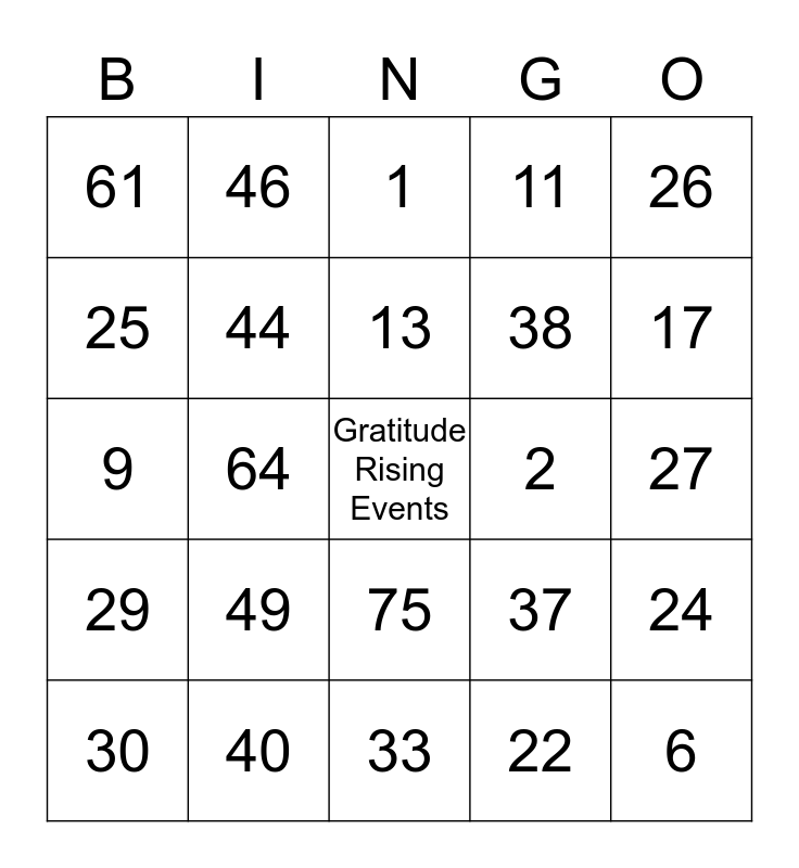 This bingo card has a free space and 24 words: 49, 40, 13, 30, 26, 61, 25, 46, 2, 75, 38, 9, 37, 24, 44, 22, 27, 1, 17, 64, 6, 29, 11 and 33.