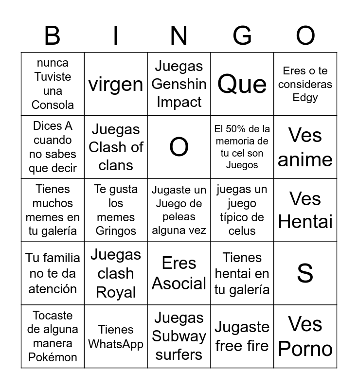 This bingo card has a free space and 29 words: Tocaste de alguna manera Pokémon, Nunca tuviste contacto con el género Opuesto, Te gusta los memes Gringos, Usas Frases en Ingles, nunca Tuviste una Consola, Juegas Genshin Impact, Juegas Clash of clans, Juegas clash Royal, juegas un juego típico de celus, Tienes WhatsApp, Ves Hentai, Ves Porno, Juegas Subway surfers, Jugaste free fire, Ves anime, Te has echo una paja alguna ves, Eres Asocial, Tu familia no te da atención, Eres o te consideras Edgy, Tienes muchos memes en tu galería, Tienes hentai en tu galería, Tienes algún anime en tu galería, El 50% de la memoria de tu cel son Juegos, Dices A cuando no sabes que decir, Que, virgen, S, O and S.
