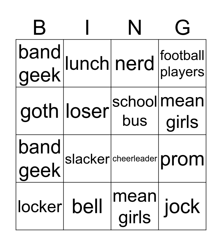 This bingo card has a free space and 15 words: locker, jock, nerd, band geek, mean girls, goth, slacker, mean girls, loser, band geek, prom, football players, school bus, lunch and bell.