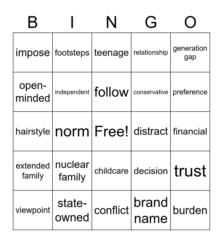 This bingo card has a free space and 31 words: conflict, treat, norm, afford, impose, teenage, independent, decision, distract, brand name, financial, burden, arise, regardless of, preference, mutual, trust, nuclear family, extended family, childcare, generation gap, table manners, viewpoint, footsteps, conservative, open-minded, relationship, hairstyle, state-owned, follow and generation.