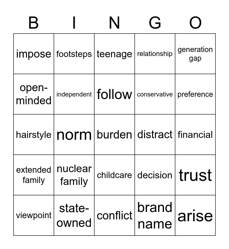 This bingo card has 31 words: conflict, treat, norm, afford, impose, teenage, independent, decision, distract, brand name, financial, burden, arise, regardless of, preference, mutual, trust, nuclear family, extended family, childcare, generation gap, table manners, viewpoint, footsteps, conservative, open-minded, relationship, hairstyle, state-owned, follow and generation.