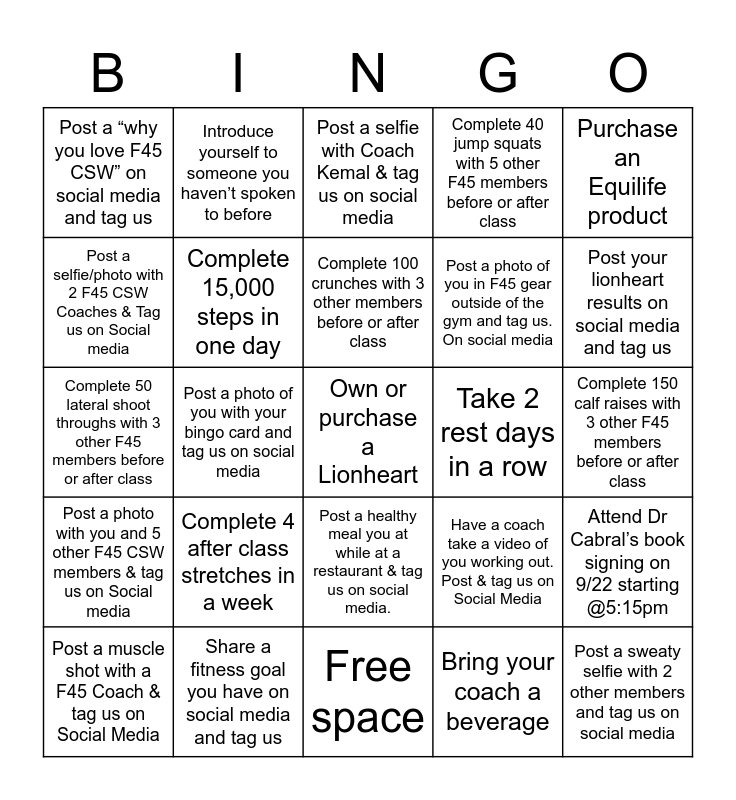 This bingo card has a free space and 24 words: Complete 4 after class stretches in a week, Share a fitness goal you have on social media and tag us, Complete 100 crunches with 3 other members before or after class, Post a muscle shot with a F45 Coach & tag us on Social Media, Purchase an Equilife product, Post a “why you love F45 CSW” on social media and tag us, Post a selfie/photo with 2 F45 CSW Coaches & Tag us on Social media, Introduce yourself to someone you haven’t spoken to before, Take 2 rest days in a row, Post a healthy meal you at while at a restaurant & tag us on social media., Post a photo of you in F45 gear outside of the gym and tag us. On social media, Complete 50 lateral shoot throughs with 3 other F45 members before or after class, Have a coach take a video of you working out. Post & tag us on Social Media, Attend Dr Cabral’s book signing on 9/22 starting @5:15pm, Complete 15,000 steps in one day, Bring your coach a beverage, Complete 150 calf raises with 3 other F45 members before or after class, Post a selfie with Coach Kemal & tag us on social media, Post your lionheart results on social media and tag us, Post a photo of you with your bingo card and tag us on social media, Post a sweaty selfie with 2 other members and tag us on social media, Post a photo with you and 5 other F45 CSW members & tag us on Social media, Complete 40 jump squats with 5 other F45 members before or after class and Free space.