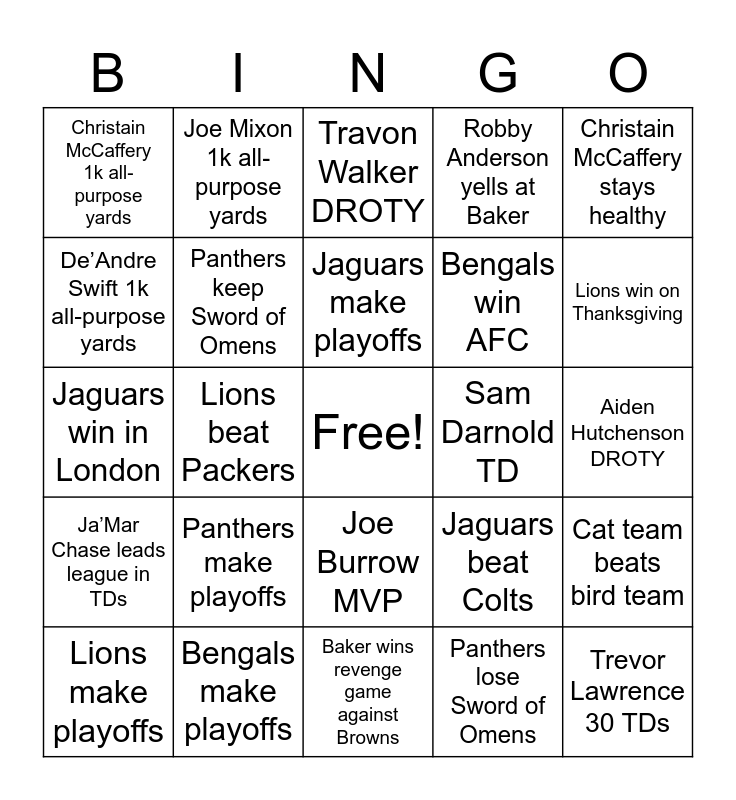 This bingo card has a free space and 24 words: Panthers make playoffs, Bengals make playoffs, Jaguars make playoffs, Lions make playoffs, Christain McCaffery stays healthy, Christain McCaffery 1k all-purpose yards, De’Andre Swift 1k all-purpose yards, Joe Mixon 1k all-purpose yards, Sam Darnold TD, Joe Burrow MVP, Bengals win AFC, Jaguars win in London, Jaguars beat Colts, Cat team beats bird team, Panthers keep Sword of Omens, Panthers lose Sword of Omens, Aiden Hutchenson DROTY, Travon Walker DROTY, Lions win on Thanksgiving, Lions beat Packers, Trevor Lawrence 30 TDs, Ja’Mar Chase leads league in TDs, Robby Anderson yells at Baker and Baker wins revenge game against Browns.