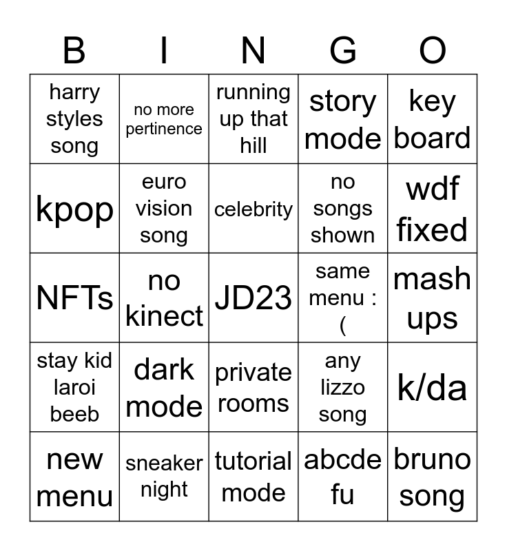 This bingo card has a free space and 24 words: dark mode, sneaker night, celebrity, new menu, key board, harry styles song, kpop, no more pertinence, same menu :(, private rooms, no songs shown, NFTs, any lizzo song, k/da, euro vision song, abcde fu, mash ups, running up that hill, wdf fixed, no kinect, bruno song, stay kid laroi beeb, story mode and tutorial mode.