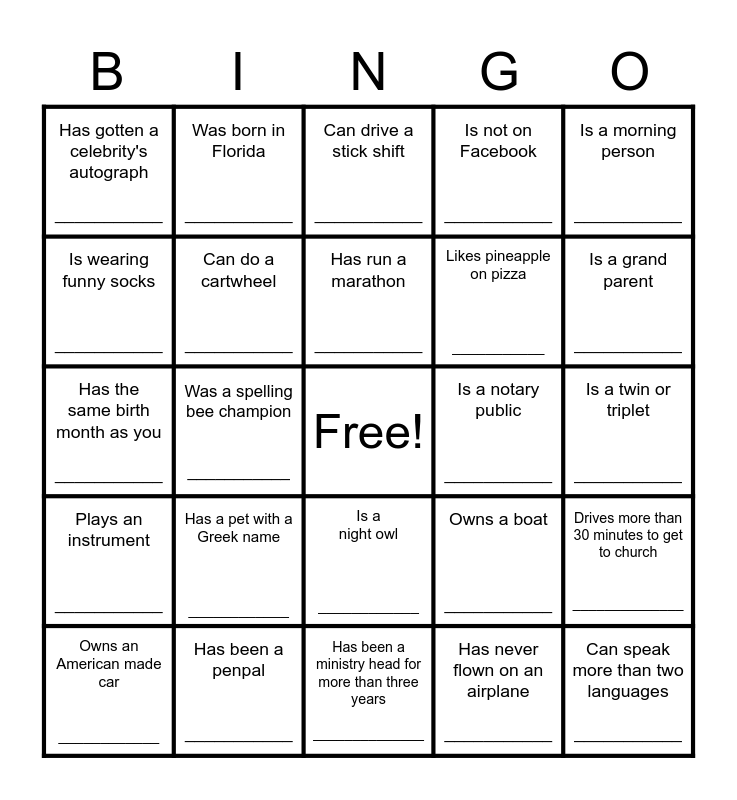 This bingo card has a free space and 24 words: Has a pet with a Greek name ____________, Has been a penpal ___________, Has run a marathon ___________, Owns an American made car ____________, Is a morning person ___________, Has gotten a celebrity's autograph ___________, Is wearing funny socks ___________, Was born in Florida ___________, Is a notary public ___________, Is a night owl ____________, Likes pineapple on pizza ___________, Has the same birth month as you ___________, Owns a boat ___________, Drives more than 30 minutes to get to church ______________, Can do a cartwheel ___________, Has never flown on an airplane ___________, Is a twin or triplet ___________, Can drive a stick shift ___________, Is a grand parent ___________, Was a spelling bee champion ___________, Can speak more than two languages ___________, Plays an instrument ___________, Is not on Facebook ___________ and Has been a ministry head for more than three years ______________.