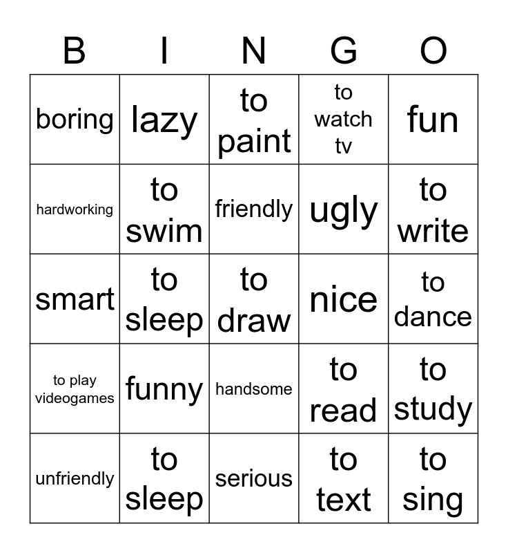 This bingo card has 25 words: funny, serious, friendly, unfriendly, fun, boring, hardworking, lazy, nice, handsome, ugly, smart, to read, to study, to swim, to sing, to dance, to paint, to write, to sleep, to draw, to sleep, to play videogames, to watch tv and to text.