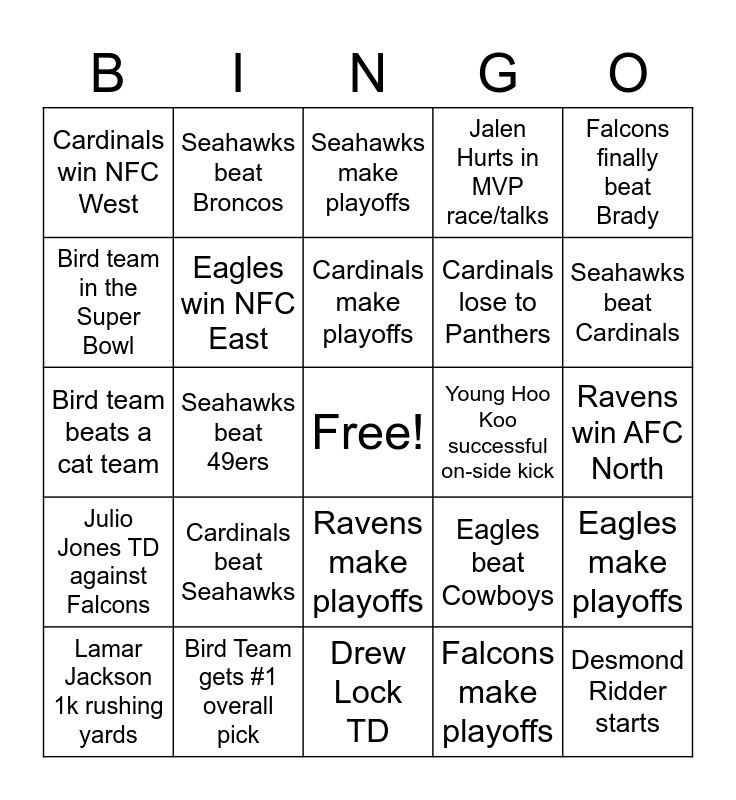 This bingo card has a free space and 24 words: Cardinals beat Seahawks, Bird Team gets #1 overall pick, Cardinals make playoffs, Lamar Jackson 1k rushing yards, Falcons finally beat Brady, Cardinals win NFC West, Bird team in the Super Bowl, Seahawks beat Broncos, Young Hoo Koo successful on-side kick, Ravens make playoffs, Cardinals lose to Panthers, Bird team beats a cat team, Eagles beat Cowboys, Eagles make playoffs, Eagles win NFC East, Falcons make playoffs, Ravens win AFC North, Seahawks make playoffs, Seahawks beat Cardinals, Seahawks beat 49ers, Desmond Ridder starts, Julio Jones TD against Falcons, Jalen Hurts in MVP race/talks and Drew Lock TD.