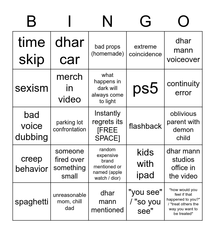 This bingo card has a free space and 24 words: someone fired over something small, unreasonable mom, chill dad, what happens in dark will always come to light, spaghetti, dhar mann voiceover, time skip, sexism, dhar car, flashback, random expensive brand mentioned or named (apple watch / dior), ps5, bad voice dubbing, kids with ipad, dhar mann studios office in the video, merch in video, "you see" / "so you see", oblivious parent with demon child, bad props (homemade), continuity error, parking lot confrontation, "how would you feel if that happened to you?" / "treat others the way you want to be treated", creep behavior, extreme coincidence and dhar mann mentioned.