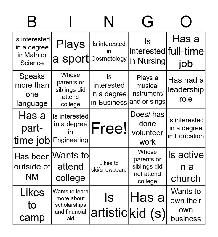 This bingo card has a free space and 24 words: Wants to attend college, Wants to learn more about scholarships and financial aid, Is interested in a degree in Business, Likes to camp, Has a full-time job, Is interested in a degree in Math or Science, Speaks more than one language, Plays a sport, Does/ has done volunteer work, Likes to ski/snowboard, Plays a musical instrument/ and or sings, Has a part-time job, Whose parents or siblings did not attend college, Is active in a church, Whose parents or siblings did attend college, Has a kid (s), Is interested in a degree in Education, Is interested in Cosmetology, Has had a leadership role, Is interested in a degree in Engineering, Wants to own their own business, Has been outside of NM, Is interested in Nursing and Is artistic.