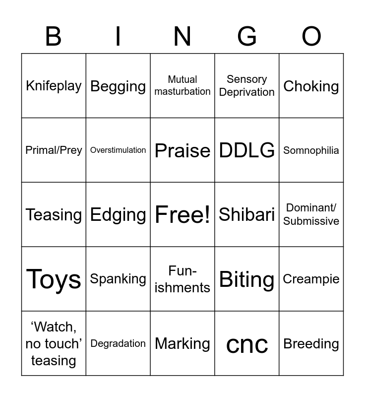 This bingo card has a free space and 24 words: Spanking, Degradation, Praise, ‘Watch, no touch’ teasing, Choking, Knifeplay, Primal/Prey, Begging, Shibari, Fun-ishments, DDLG, Teasing, Biting, Creampie, Overstimulation, cnc, Dominant/ Submissive, Mutual masturbation, Somnophilia, Edging, Breeding, Toys, Sensory Deprivation and Marking.