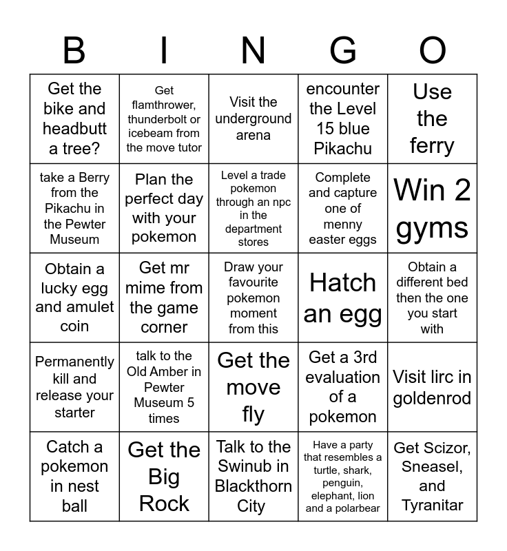 This bingo card has 30 words: Catch a pokemon in nest ball, Get a fossil pokemon, Level a trade pokemon through an npc in the department stores, Get girafarig from the game corner, Use the ferry, Get the bike and headbutt a tree?, Get flamthrower, thunderbolt or icebeam from the move tutor, Get the move fly, Hatch an egg, Get Scizor, Sneasel, and Tyranitar, Permanently kill and release your starter, Plan the perfect day with your pokemon, Use an evaluation stone, Have a party that resembles a turtle, shark, penguin, elephant, lion and a polarbear, Visit lirc in goldenrod, Catch the first pokemon you see and call it truffles, Get mr mime from the game corner, Draw your favourite pokemon moment from this, Get a 3rd evaluation of a pokemon, Win 2 gyms, Obtain a lucky egg and amulet coin, Get the Big Rock, Visit the underground arena, Complete and capture one of menny easter eggs, Obtain a different bed then the one you start with, take a Berry from the Pikachu in the Pewter Museum, talk to the Old Amber in Pewter Museum 5 times, Talk to the Swinub in Blackthorn City, encounter the Level 15 blue Pikachu and Use th hm cut with a sword.