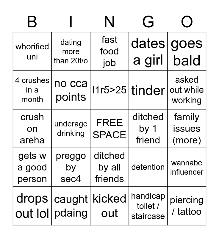 This bingo card has a free space and 24 words: preggo by sec4, caught pdaing, l1r5>25, drops out lol, goes bald, whorified uni, 4 crushes in a month, dating more than 20t/o, ditched by 1 friend, ditched by all friends, tinder, crush on areha, detention, wannabe influencer, no cca points, handicap toilet / staircase, family issues (more), fast food job, asked out while working, underage drinking, piercing / tattoo, gets w a good person, dates a girl and kicked out.