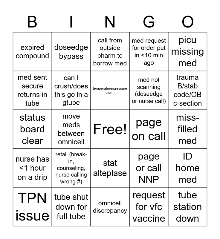 This bingo card has a free space and 39 words: missing lipid/adjust lipid time, weird/inappropriate item in return bin, compatibility question, can I crush/does this go in a gtube, TPN issue, stat alteplase, temperature/pressure alarm, floorstock insulin, picu missing med, nurse has <1 hour on a drip, move meds between omnicell, med request for order put in <10 min ago, tube station down, miss-filled med, page on call, retail (break-in, counseling, nurse calling wrong #), med message requesting drug in omnicell, expired compound, smog compound, page or call NNP, med sent secure returns in tube, omnicell discrepancy, med not scanning (doseedge or nurse call), trauma B/stab code/OB c-section, expired med (not compound), call from OR, new DKA needs bags STAT, calling maintenance or environmental services, pharm-is ticket, doseedge bypass, brand new TPN, new LOS/EOS orders, call from outside pharm to borrow med, tube shut down for full tube, request for vfc vaccine, recon antibiotic, ID home med, status board clear and request for on call electrolytes.