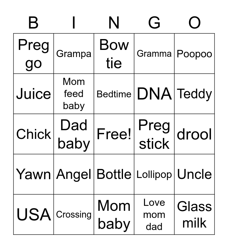 This bingo card has a free space and 29 words: USA, Baby, Dad baby, CAd, Preg go, Bow tie, Mom feed baby, Angel, Preg stick, Crossing, drool, Glass milk, Mom baby, Love mom dad, Teddy, Barf, Bottle, Yawn, Poopoo, Chick, Lollipop, Money, DNA, Juice, Gramma, Grampa, Uncle, Bedtime and Bath time.