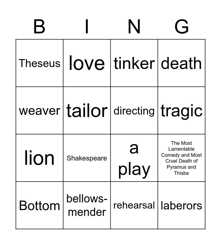 This bingo card has 20 words: The Most Lamentable Comedy and Most Cruel Death of Pyramus and Thisbe, acting, tinker, Flute, Bottom, weaver, bellows-mender, Theseus, lion, love, Shakespeare, a play, tailor, laberors, directing, wedding, tragic, death, rehearsal and roles.