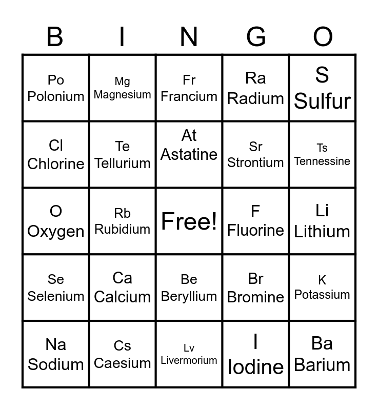 This bingo card has a free space and 24 words: Ca Calcium, Cs Caesium, At Astatine, Na Sodium, S Sulfur, Po Polonium, Cl Chlorine, Mg Magnesium, F Fluorine, Be Beryllium, Sr Strontium, O Oxygen, Br Bromine, K Potassium, Te Tellurium, I Iodine, Li Lithium, Fr Francium, Ts Tennessine, Rb Rubidium, Ba Barium, Se Selenium, Ra Radium and Lv Livermorium.