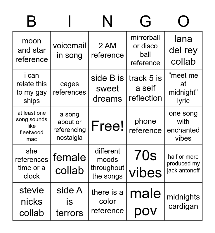 This bingo card has a free space and 24 words: female collab, side A is terrors, side B is sweet dreams, stevie nicks collab, lana del rey collab, moon and star reference, i can relate this to my gay ships, voicemail in song, phone reference, different moods throughout the songs, track 5 is a self reflection, at least one song sounds like fleetwood mac, 70s vibes, half or more produced my jack antonoff, cages references, male pov, one song with enchanted vibes, 2 AM reference, "meet me at midnight" lyric, a song about or referencing nostalgia, midnights cardigan, she references time or a clock, mirrorball or disco ball reference and there is a color reference.