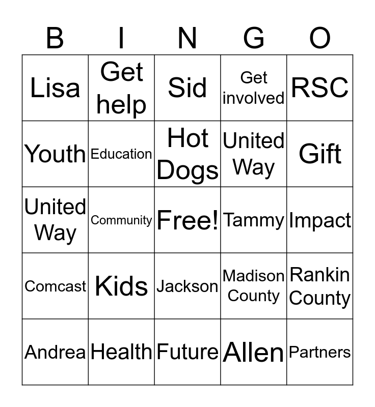 This bingo card has a free space and 24 words: Kids, Health, Hot Dogs, Andrea, RSC, Lisa, Youth, Get help, Tammy, Jackson, United Way, United Way, Madison County, Rankin County, Education, Allen, Impact, Sid, Gift, Community, Partners, Comcast, Get involved and Future.