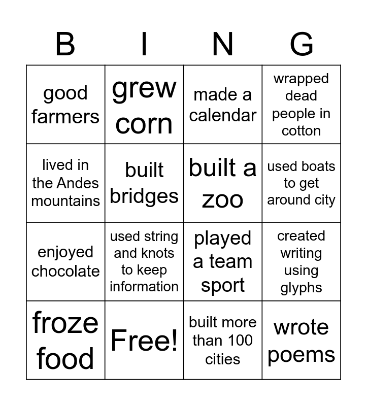 This bingo card has 16 words: Free!, created writing using glyphs, made a calendar, good farmers, enjoyed chocolate, grew corn, played a team sport, built more than 100 cities, lived in the Andes mountains, built bridges, froze food, wrapped dead people in cotton, used string and knots to keep information, used boats to get around city, built a zoo and wrote poems.