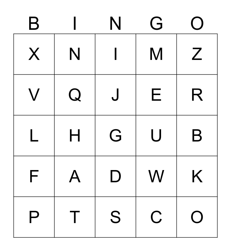 This bingo card has a free space and 24 words: A, T, J, P, Z, X, V, N, U, D, E, L, W, K, Q, C, B, I, R, H, O, F, M and S.