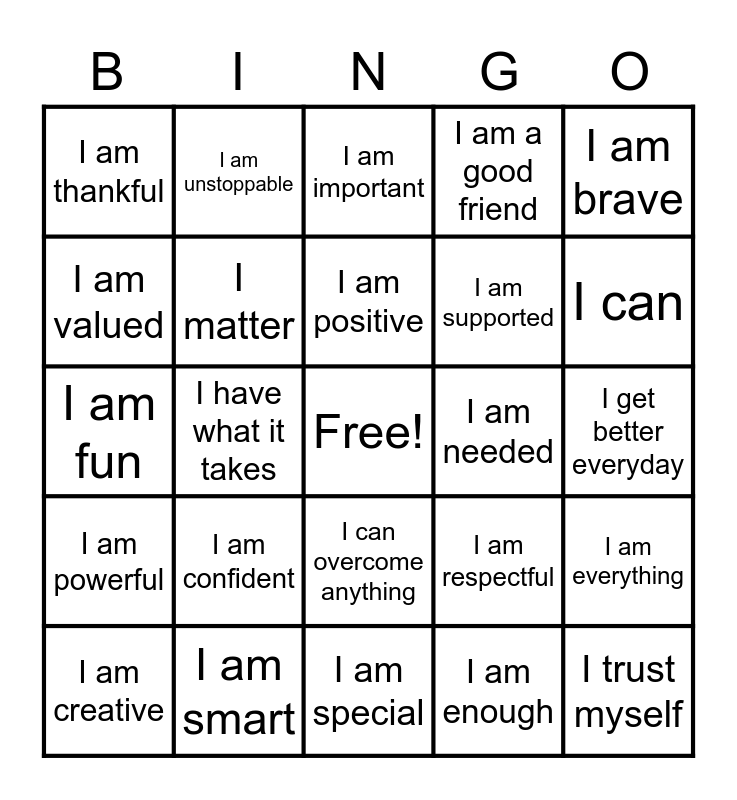 This bingo card has a free space and 34 words: I am loved, I am enough, I am strong, I am safe, I am powerful, I matter, I am brave, I am creative, I am unstoppable, I am unique, I am positive, I am important, I am appreciated, I have a bright future, I am needed, I can, I am smart, I am fun, I am confident, I am respectful, I can overcome anything, I can be successful, I am thankful, I get better everyday, I am special, I trust myself, I am a good friend, I am Awesome, I am supported, I am valued, I am happy, I have what it takes, I am everything and I love myself.