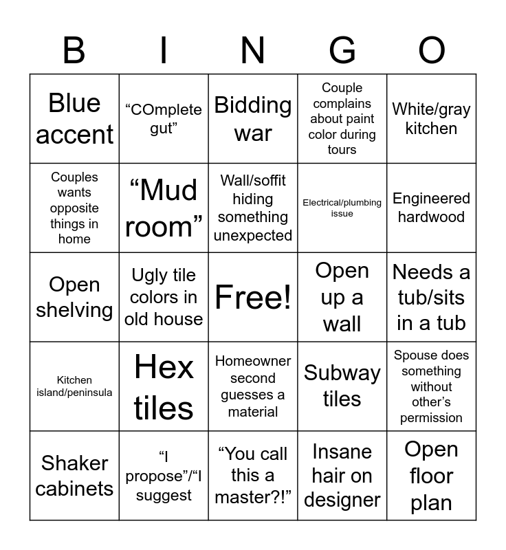 This bingo card has a free space and 24 words: Hex tiles, “I propose”/“I suggest, Wall/soffit hiding something unexpected, Shaker cabinets, White/gray kitchen, Blue accent, Couples wants opposite things in home, “COmplete gut”, Open up a wall, Homeowner second guesses a material, Electrical/plumbing issue, Open shelving, Subway tiles, Spouse does something without other’s permission, “Mud room”, Insane hair on designer, Needs a tub/sits in a tub, Bidding war, Engineered hardwood, Ugly tile colors in old house, Open floor plan, Kitchen island/peninsula, Couple complains about paint color during tours and “You call this a master?!”.