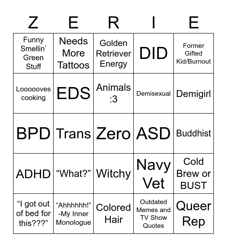 This bingo card has a free space and 24 words: “What?”, “Ahhhhhh!” -My Inner Monologue, Animals :3, “I got out of bed for this???”, Former Gifted Kid/Burnout, Funny Smellin’ Green Stuff, Loooooves cooking, Needs More Tattoos, ASD, Witchy, Demisexual, BPD, Navy Vet, Cold Brew or BUST, EDS, Outdated Memes and TV Show Quotes, Buddhist, Golden Retriever Energy, Demigirl, Trans, Queer Rep, ADHD, DID and Colored Hair.
