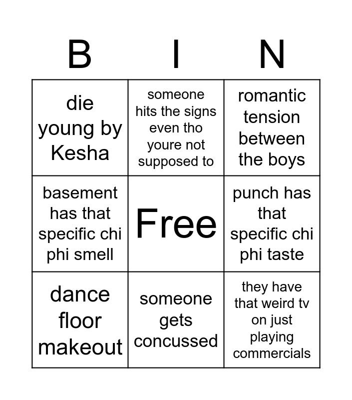 This bingo card has a free space and 8 words: punch has that specific chi phi taste, romantic tension between the boys, someone hits the signs even tho youre not supposed to, dance floor makeout, die young by Kesha, they have that weird tv on just playing commercials, basement has that specific chi phi smell and someone gets concussed.