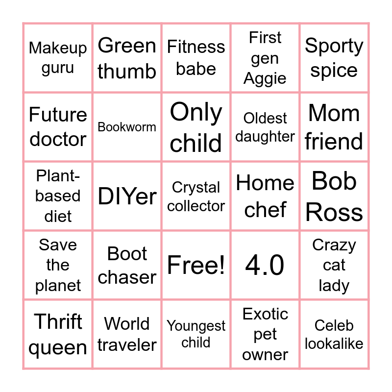 This bingo card has 26 words: Free!, Exotic pet owner, Only child, World traveler, Sporty spice, Makeup guru, Future doctor, Green thumb, Bob Ross, 4.0, Oldest daughter, Plant-based diet, Crazy cat lady, Thrift queen, DIYer, Shopaholic, First gen Aggie, Save the planet, Fitness babe, Crystal collector, Mom friend, Youngest child, Home chef, Boot chaser, Bookworm and Celeb lookalike.