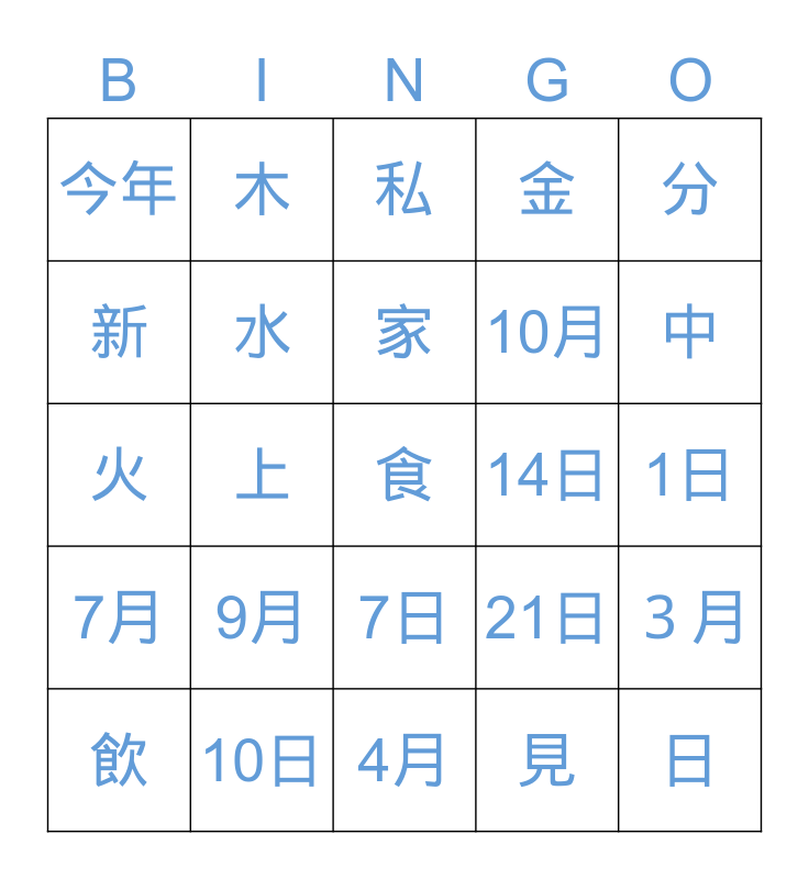This bingo card has a free space and 74 words: 名前, 国, 私, 父, 母, 子ども, 日本, 水, 飲, 魚, 肉, 好, 家, 新, 古, 上, 下, 中, 月, 火, 水, 木, 金, 土, 日, 曜日, 朝, 昼, 夜, 時, 分, 半, 枚, 読, 聞, 見, 本, 友, 何, 年, 4月, 10日, 今日, 今週, 今度, 今年, 今月, 9月, 12月, 9日, 5日, 6日, 1日, 2日, 3日, 4日, 7日, 8日, 20日, 3月, 10月, 6月, 7月, 11月, 14日, 24日, 31日, 16日, 21日, 12日, 15日, 17日, 18日 and 19日.