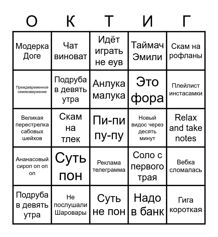 This bingo card has a free space and 24 words: Суть пон, Не послушали Шаровары, Анлука малука, Подруба в девять утра, Скам на рофланы, Модерка Доге, Преждевременное семяизвержение, Чат виноват, Новый видос через десять минут, Реклама телеграмма, Это фора, Великая перестрелка сабовых шейхов, Соло с первого трая, Вебка сломалась, Подруба в девять утра, Надо в банк, Relax and take notes, Идёт играть не еув, Плейлист инстасамки, Скам на тлек, Гига короткая, Ананасовый сироп оп оп оп, Таймач Эмили and Суть не пон.