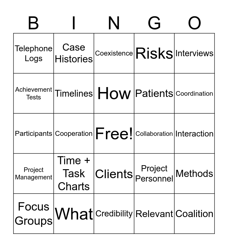 This bingo card has a free space and 24 words: Time + Task Charts, What, How, Focus Groups, Interviews, Telephone Logs, Achievement Tests, Case Histories, Collaboration, Clients, Patients, Participants, Project Personnel, Methods, Timelines, Relevant, Interaction, Coexistence, Coordination, Cooperation, Coalition, Project Management, Risks and Credibility.