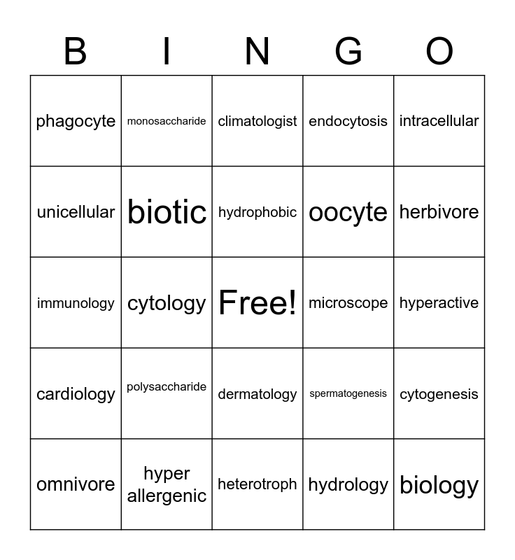 This bingo card has a free space and 46 words: transport, biology, autotroph, heterotroph, polysaccharide, disaccharide, monosaccharide, multicellular, unicellular, abiotic, biotic, endocytosis, cytogenesis, spermatogenesis, cytoplasm, hydrophilic, hydrophobic, microscope, hydrolysis, intracellular, cytology, hydrology, phagocyte, oocyte, photosynthesis, herbivore, omnivore, carnivore, dermatology, cardiology, chromosome, diatomic, monatomic, extracellular, hypoallergenic, hyper allergenic, hyperactive, genealogy, neurology, geology, thermometer, climatologist, immunology, microbiology, volcanology and zoology.