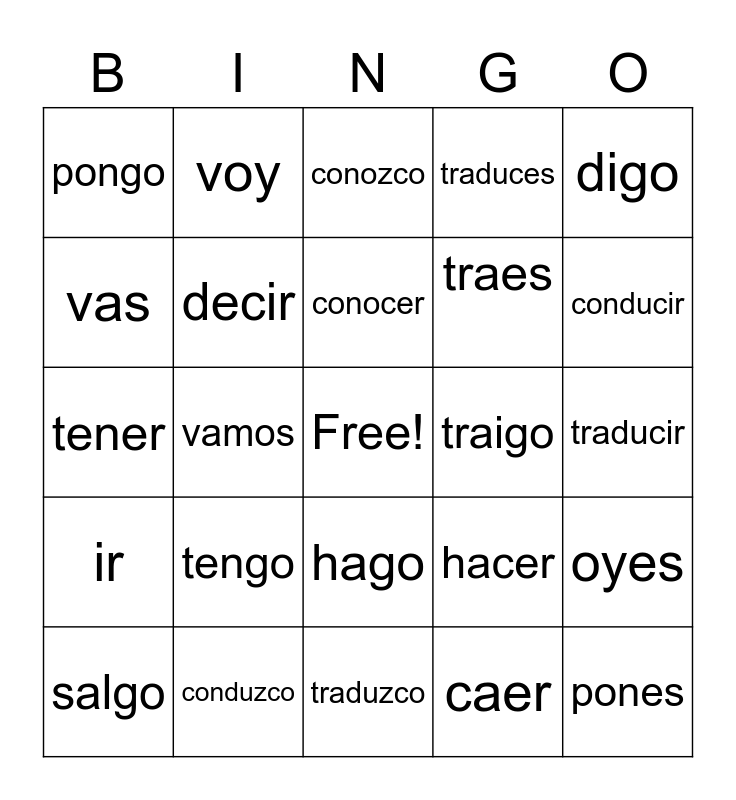 This bingo card has a free space and 34 words: traer, caer, oír, salir, ir, decir, digo, salgo, voy, oigo, conocer, conozco, saber, sé, traigo, conducir, conduzco, tener, tengo, hacer, hago, poner, pongo, traducir, traduzco, pones, traduces, haces, traes, vas, conocemos, vamos, oyes and oye.