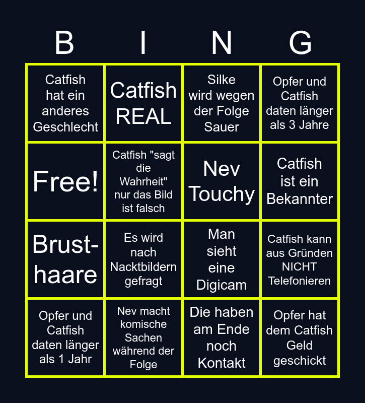 This bingo card has 16 words: Nev macht komische Sachen während der Folge, Catfish kann aus Gründen NICHT Telefonieren, Silke wird wegen der Folge Sauer, Catfish hat ein anderes Geschlecht, Brust-haare, Catfish REAL, Man sieht eine Digicam, Die haben am Ende noch Kontakt, Free!, Catfish "sagt die Wahrheit" nur das Bild ist falsch, Opfer und Catfish daten länger als 1 Jahr, Opfer und Catfish daten länger als 3 Jahre, Es wird nach Nacktbildern gefragt, Catfish ist ein Bekannter, Nev Touchy and Opfer hat dem Catfish Geld geschickt.